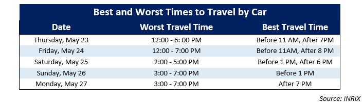 INRIX, a provider of transportation data and insights, says drivers leaving Thursday or Friday should hit the road early to avoid mixing with commuters. Travelers going back home on Sunday or Monday should avoid the afternoon hours when return trips will peak.