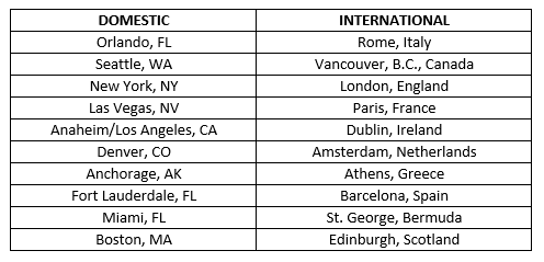 European cities dominate the international list. The top 10 domestic and international destinations below are based on AAA booking data.