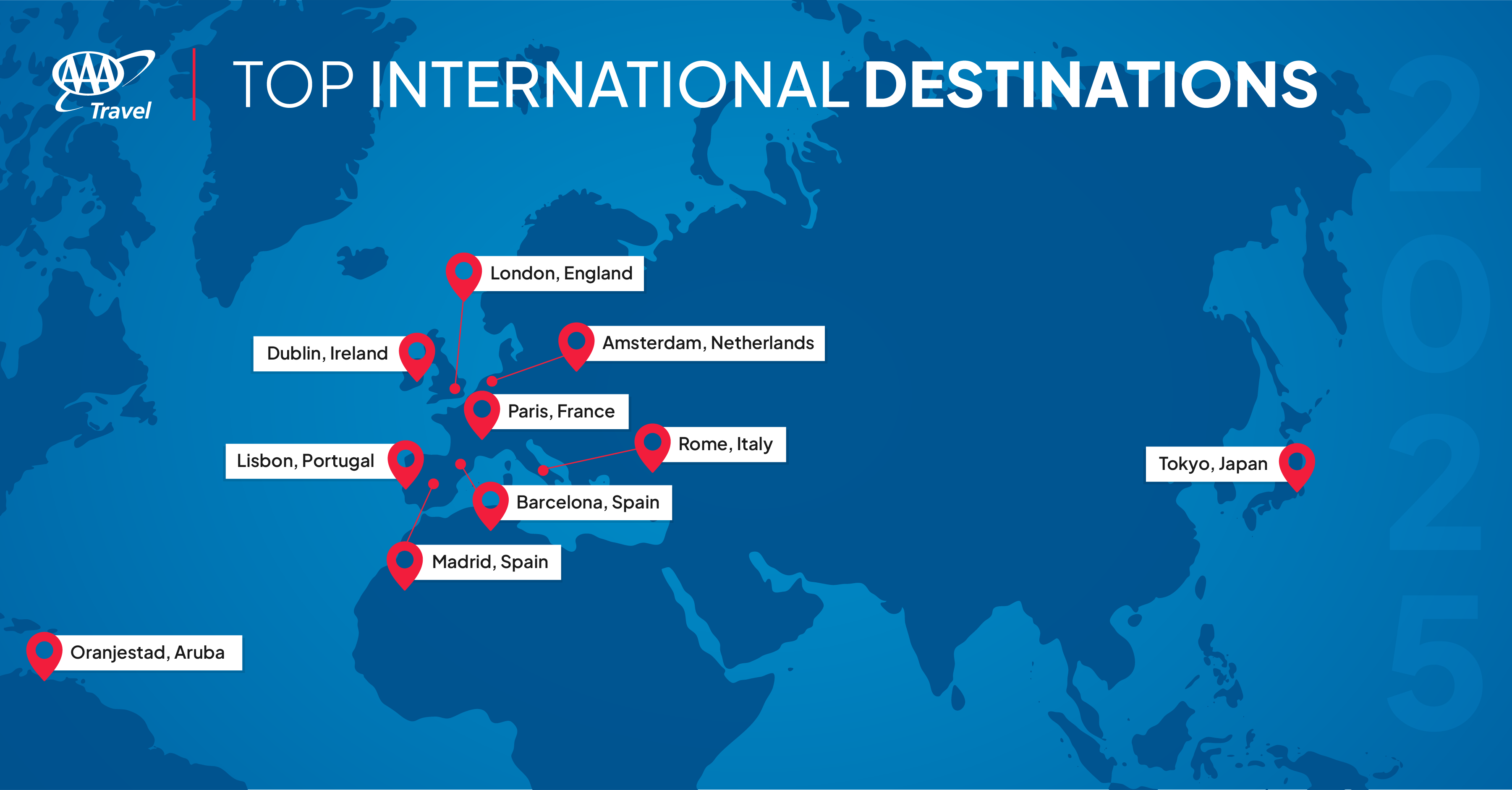 On the international list, eight of the top 10 cities are in Europe. Rome is number one, followed by London and Paris. Two Spanish cities are also on the list: Barcelona and Madrid. The Caribbean island of Aruba is another top Spring Break destination, as well as Tokyo, Japan. “Travel to Asia, particularly Japan, has been booming the past year, with more Americans interested in exploring all that Asian countries have to offer,” added Barber.